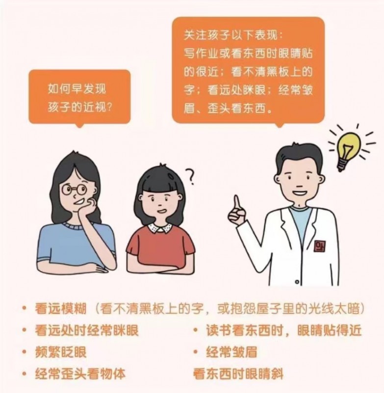 查看详情>>如何尽早发现孩子的眼睛是否近视?很多爸爸妈妈带着孩子第一次去医院检查眼睛时,发现孩子的近视度数已经比较高,后悔莫及。所以父母和孩子要共同警惕下面一些近视的常见早期症状,出现后要及时带孩子到眼科检查。学