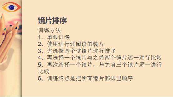 一、镜片阅读:使用工具:(+2.50~-1/2APM)镜片,间隔0.50D单眼训练,训练APM。训练方法:采用40CM处能看清的小视标,镜片贴着眼镜,让其感受正镜片放松(字体变大变远)、负镜片紧张(字